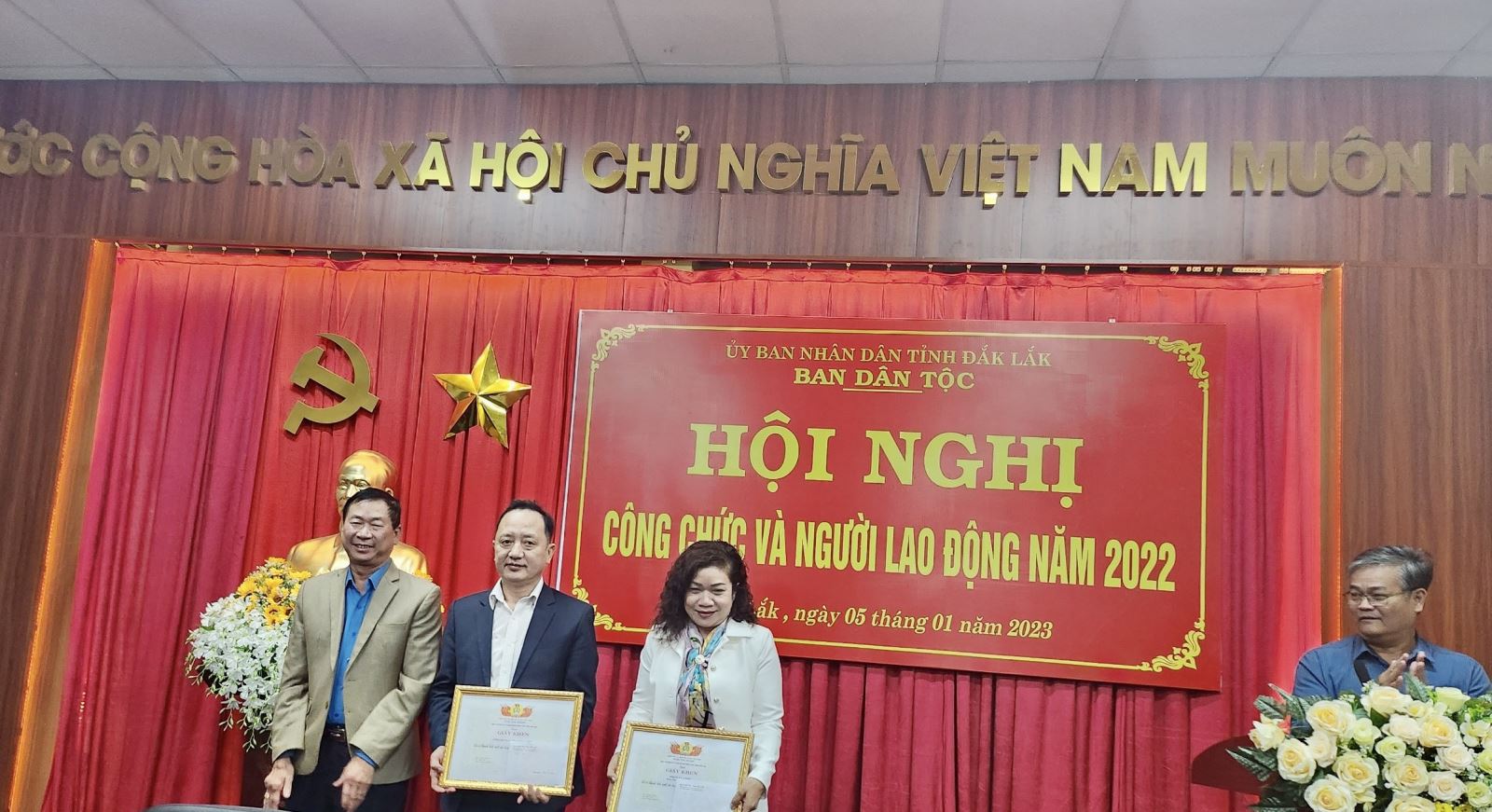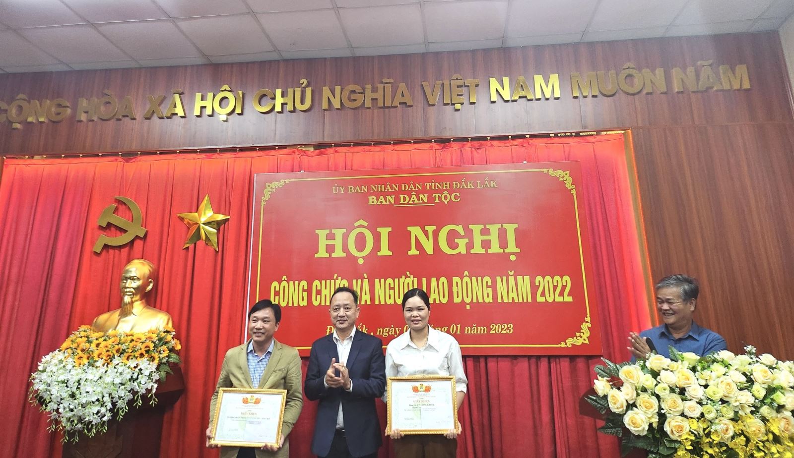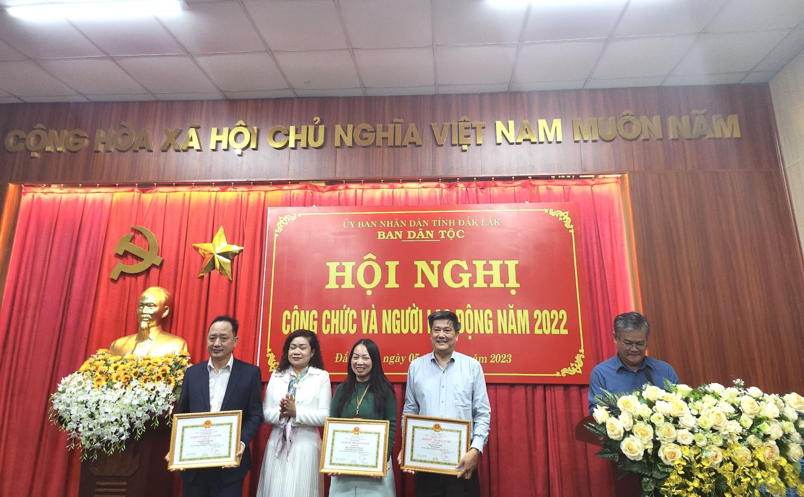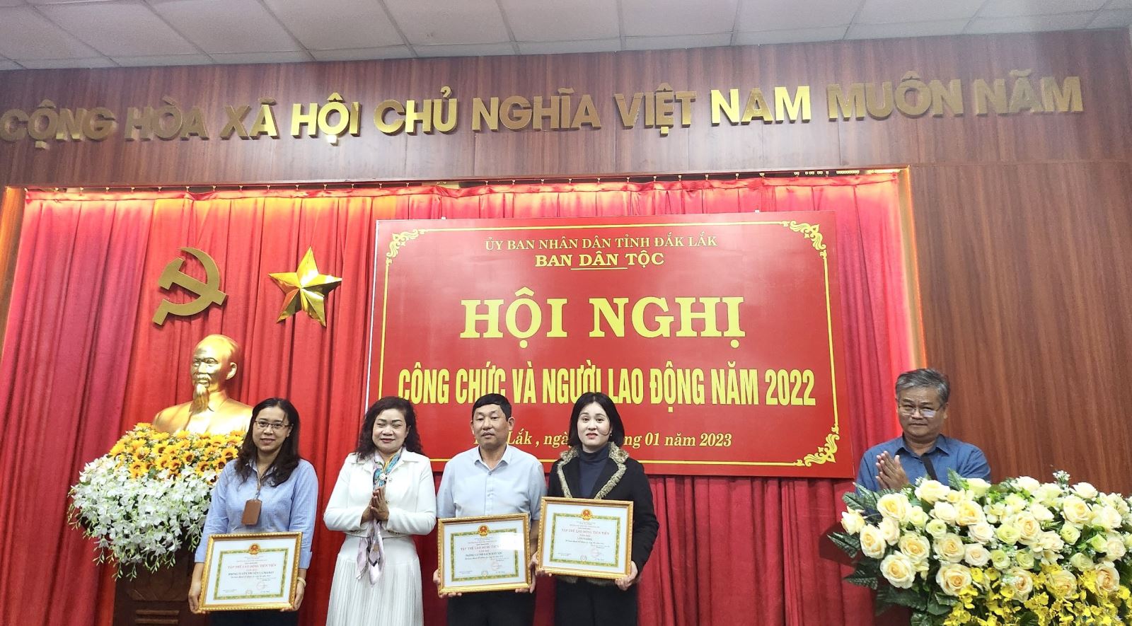 Tại hội nghị, đồng chí H’ Yâo Knul - Bí thư Chi bộ, Trưởng Ban Dân tộc đã trao Giấy khen cho 03 tập thể; 04 cá nhân hoàn thành xuất sắc nhiệm vụ và 19 cá nhân hoàn thành tốt nhiệm vụ năm 2022 của Ban Dân tộc. Ban Chấp hành Công đoàn Viên chức tỉnh đã trao tặng Giấy khen cho tập thể Công đoàn cơ sở Ban Dân tộc tỉnh và 01 cá nhân; Ban Chấp hành công đoàn cơ quan đã trao tặng Giấy Khen cho 01 tập thể tổ công đoàn và 01 cá nhân có thành tích xuất sắc trong hoạt động năm 2022.