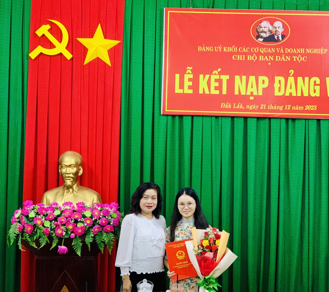 Thực hiện Quyết định của Ban Thường vụ Đảng ủy Khối các cơ quan và doanh nghiệp tỉnh, chiều ngày 21/12/2023 tại Trụ sở Ban Dân tộc tỉnh, Chi bộ Ban Dân tộc trang trọng tổ chức Lễ kết nạp đảng viên mới cho quần chúng ưu tú Trần Thị Hà - Chuyên viên Phòng Chính sách Dân tộc.
