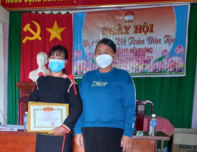 Nữ Bí thư Chi bộ buôn H Ngok Êban (bên phải) trong Ngày hội đại đoàn kết toàn dân tại buôn Sứt Mđưng. Ảnh: Nhân vật cung cấp