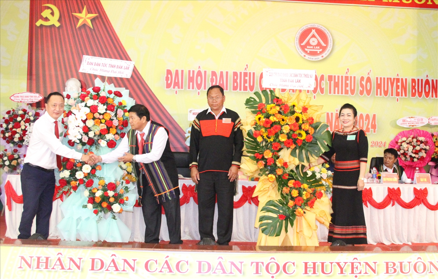 Đại diện Ban Chỉ đạo Đại hội DTTS tỉnh Đắk Lắk lần thứ IV - năm 2024 và lãnh đạo Ban Dân tộc tỉnh Đắk Lắk tặng hoa chúc mừng Đại hội