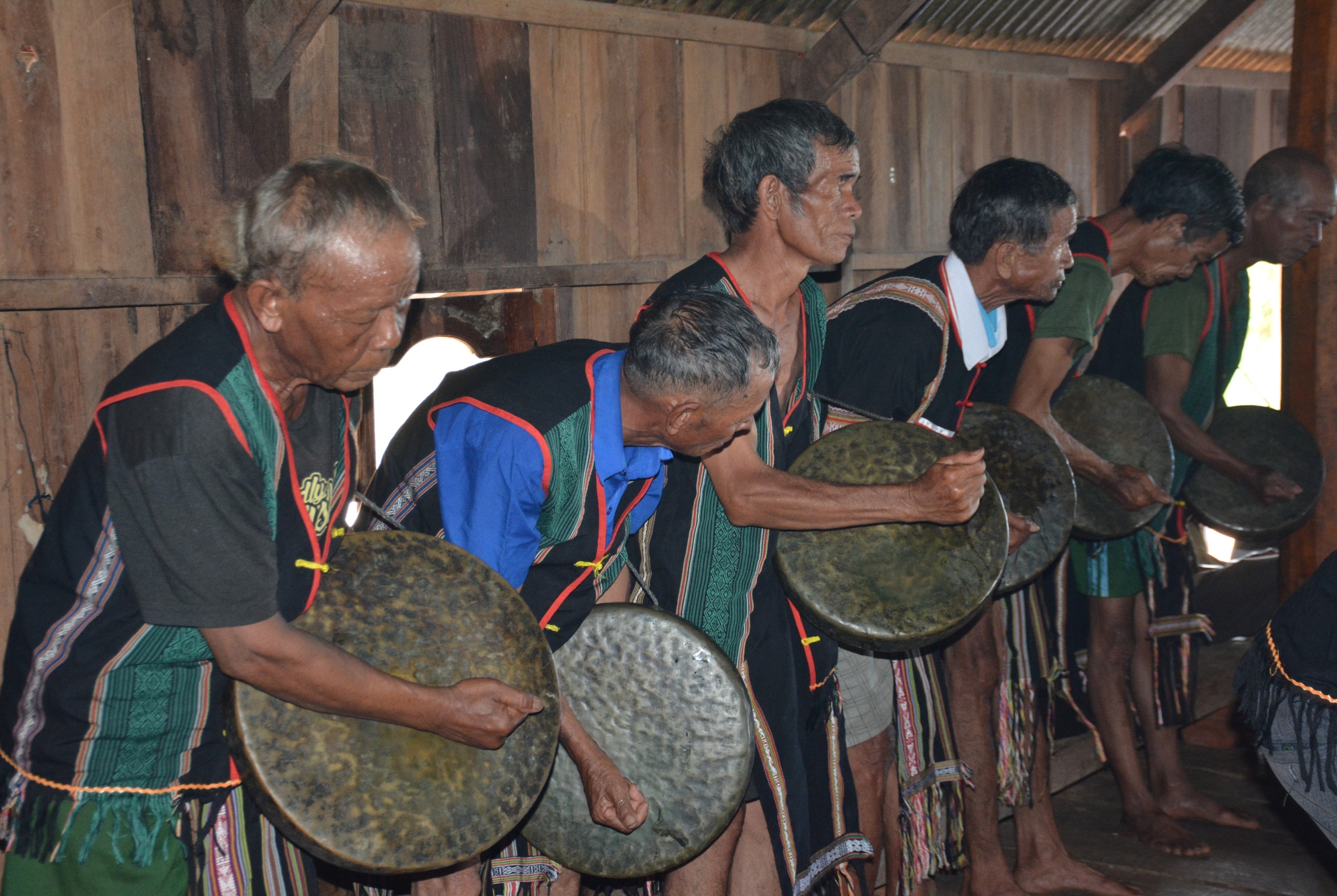 Đội đánh chiêng diễn tấu chiêng liên tục xuyên suốt buổi lễ.