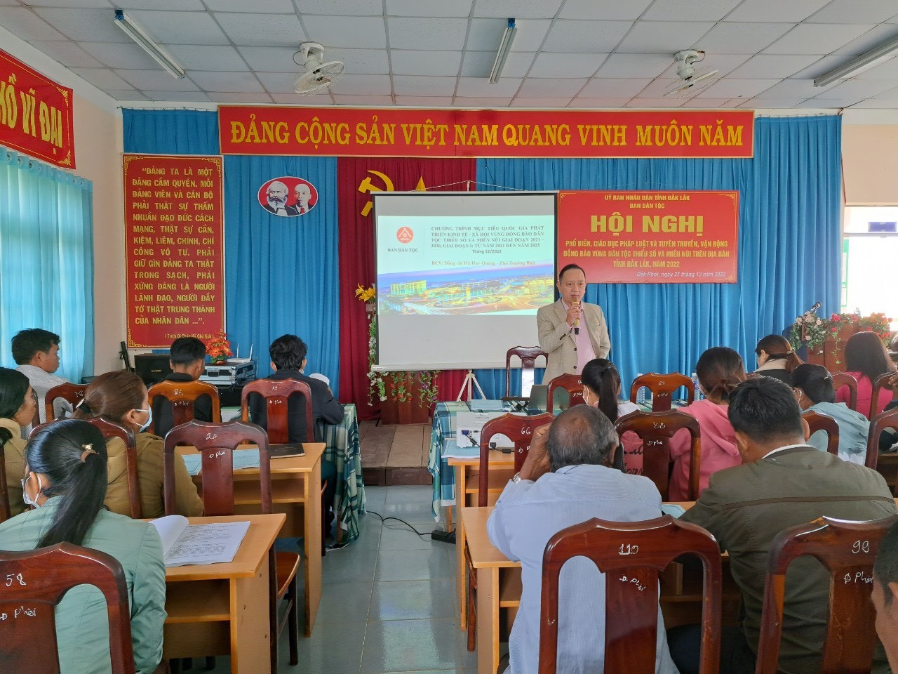 Ngày 23 và ngày 27, 28/12/2022, Ban Dân tộc tỉnh đã tổ chức 03 Hội nghị phổ biến, giáo dục pháp luật và tuyên truyền, vận động đồng bào dân tộc thiểu số tại 03 huyện trên địa bàn tỉnh, gồm: xã Cư Amung huyện Ea H’leo; xã Đắk Phơi huyện Lắk và buôn Drang Phốk, xã Krông Na, huyện Buôn Đôn với hơn 290 đại biểu tham dự.